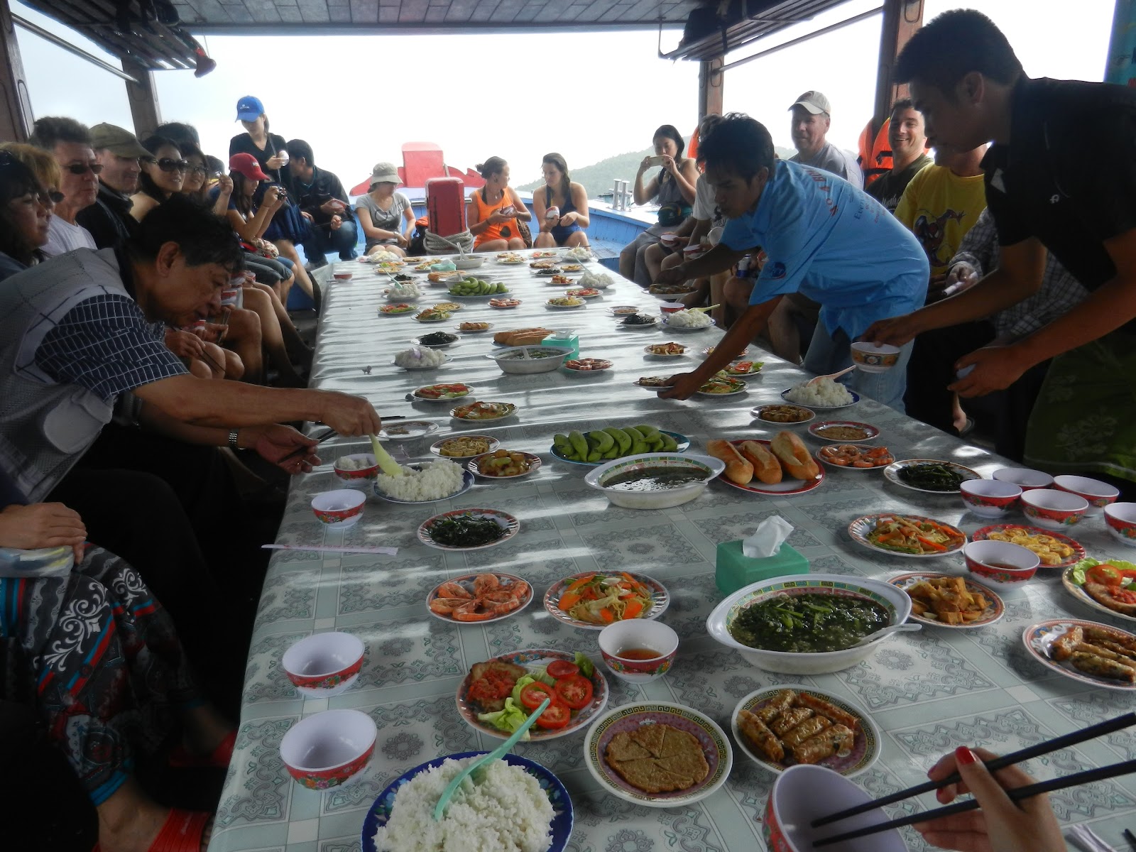 Third stop was close to the Bamboo island, we actually anchored ourselves next to a floating fishing village where you were able to buy some food to be cooked for you. The lobster felt really pricey, a one huge over a kilo in weight lobster cost 120 USD and the animals were left to rest in peace. After that the backs of the benches were turned down and they formed a big table. The lunch was offered, it was amazing, the food so vast and vary accompanied with fruits later. After the dinner was cleared it was time for a party, the "boat nr. 4 trip" crew had their own boy band and so they started to play music. We also tried some sea urchin.